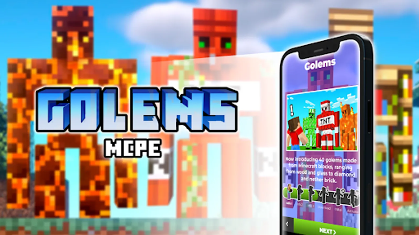 Download Golems for Minecraft PE right now, and enjoy all new addons to your Minecraft Pocket Edition blocks world!