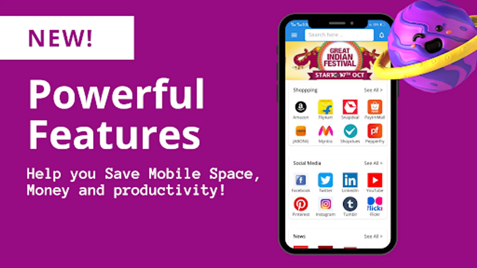 With this All in one App It is not necessary to visit all of the websites and download each of their unique applications in order to do online shopping. All popular shopping websites in India are represented by this app. These include the flipkart App, the amazon App, the snapdeal App, the myntra App, the shopclues App, the AJIO App, the Tata Cliq App, the OLX App, the Shein App, and the club factory App.