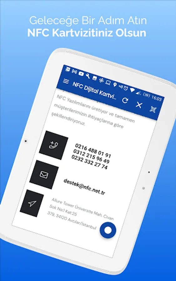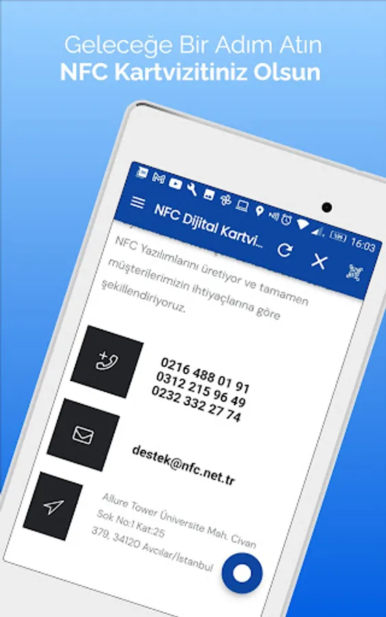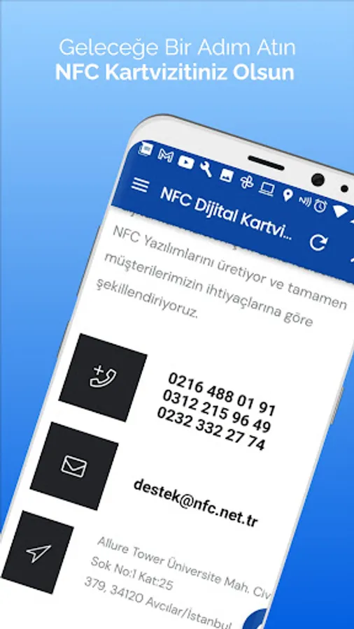 Bring the power of digital business cards into your palm with the NFC.net.tr mobile application! Everything you need for effective communication in the business world is in this application. Create, easily share and update your own digital business cards. Quickly establish connections and expand your business network thanks to NFC technology. Get rid of the limitations of traditional business cards and reach the advantages of the digital age with the NFC.net.tr mobile application. Download now and enjoy standing out in the business world!