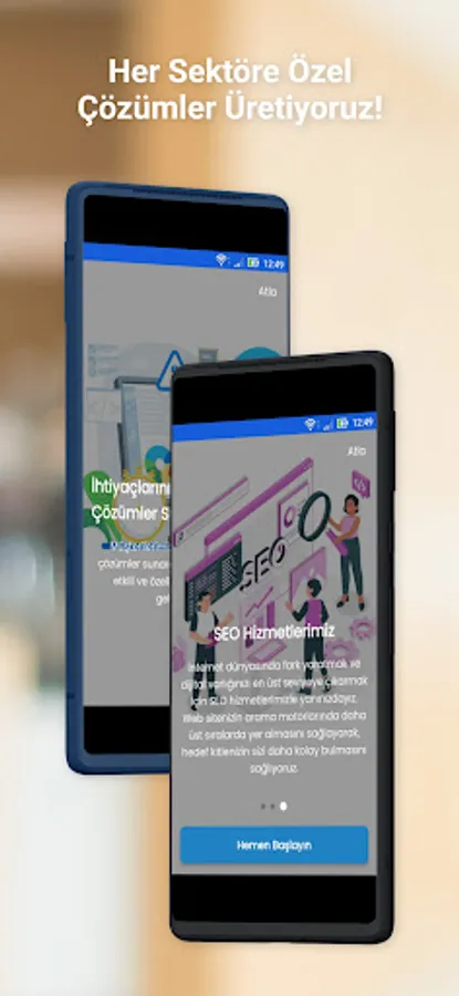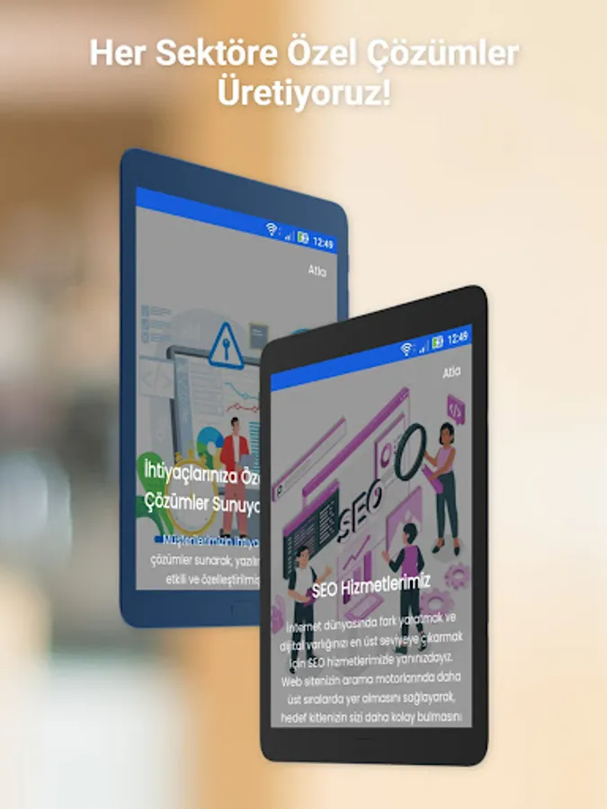 Services in Many Fields: Mobile Application Development, Website Design, Corporate Website Software, Personal Website Software, Tourism Software, E-Commerce, E-Export Software, Marketplace Software, Real Estate Website Software, Customized Software Solutions, SEO Services and more more than. Whatever your need, we are here to offer you the most suitable solution.