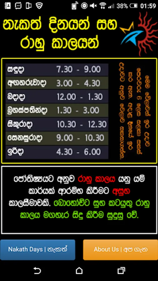 මෙම ඇප් එක හරහා අප ඔබට වර්ෂ 2040 දක්වා නැකත් දිනයන් සහ වේලාවන් ගේන ඒමට කටයුතු කර ඇත. ඇප් එකේ දක්වා ඇති දිනයන් සහ වේලාවන් නක්ෂත්ර කරුවෙකු ලවා නැවත තහවුරු කරගන්නේ නම් මැනවි. එසේම සිංහල හා දෙමල අලුත් අවුරුදු නැකත් ද ඇප් එක හරහා ලබාගත හැකි අතර රාහුකාලයද ශ්රී ලංකා සම්මත වේලාවෙන් දිනපතා ඔබට ලබාගත හැක.