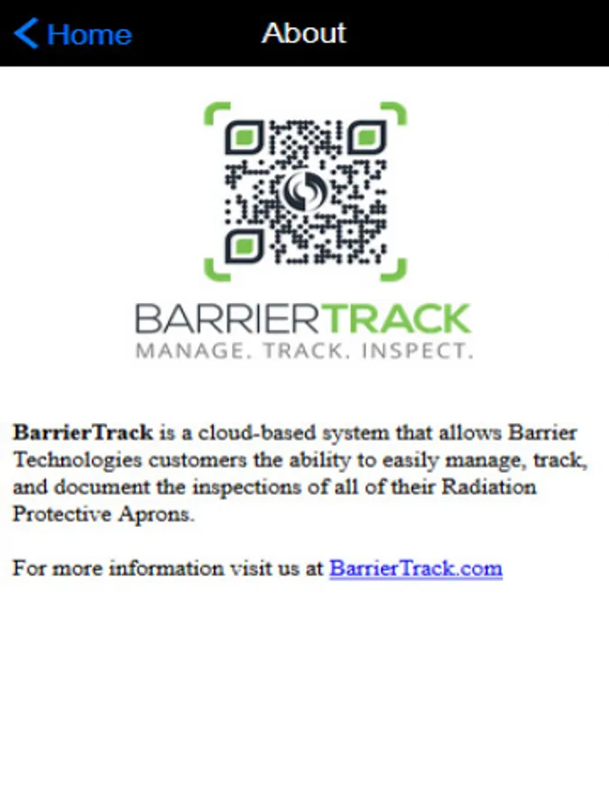 BarrierTrack mobile app is a QR barcode scanner for Barrier Technologies Radiation Protective Aprons. Easily access your Apron's information by scanning the QR code.