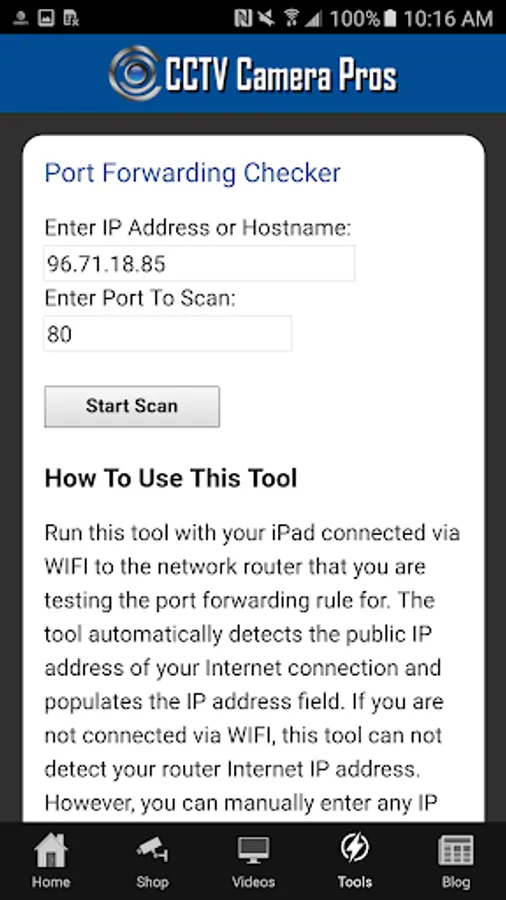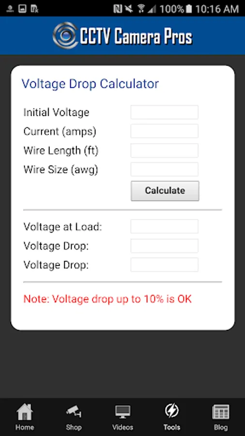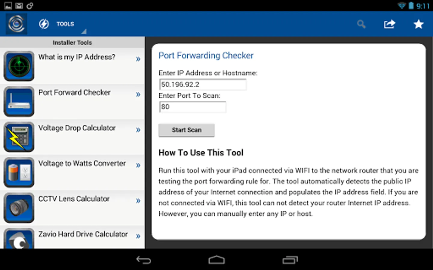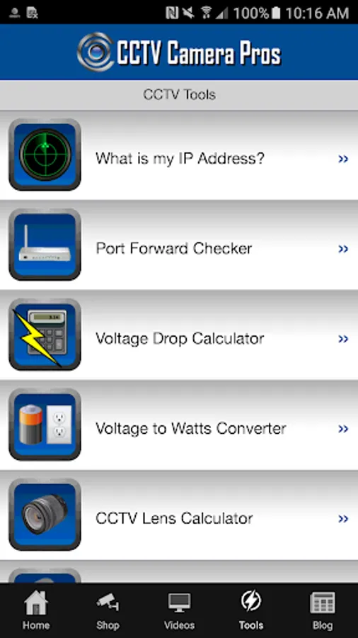 The CCTV Camera Pros mobile app for Android allows customers to shop for video surveillance equipment from their mobile phone or tablet. The application also contains valuable security installer tools such as the voltage drop calculator, AC to DC power converter, open port forward checker, CCTV lens calculator, and IP address locator (what is my IP address?). These online tools are handy for video surveillance system installers to use while planning systems and troubleshooting on job sites.