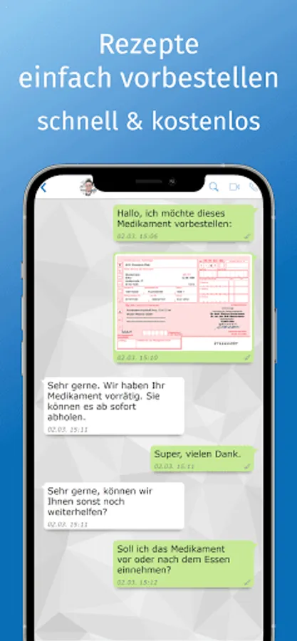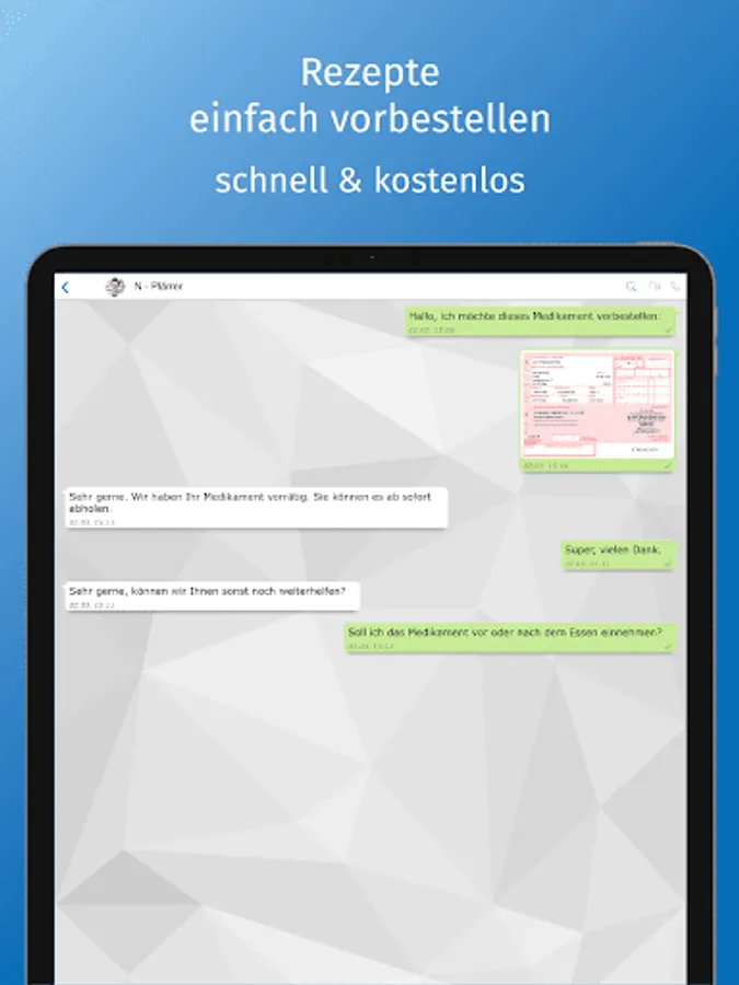 With the M-Chat you can easily order medicines, prescriptions and e-prescriptions, put them aside or have them delivered. Write us a message - The app works just as easily as a messenger.
