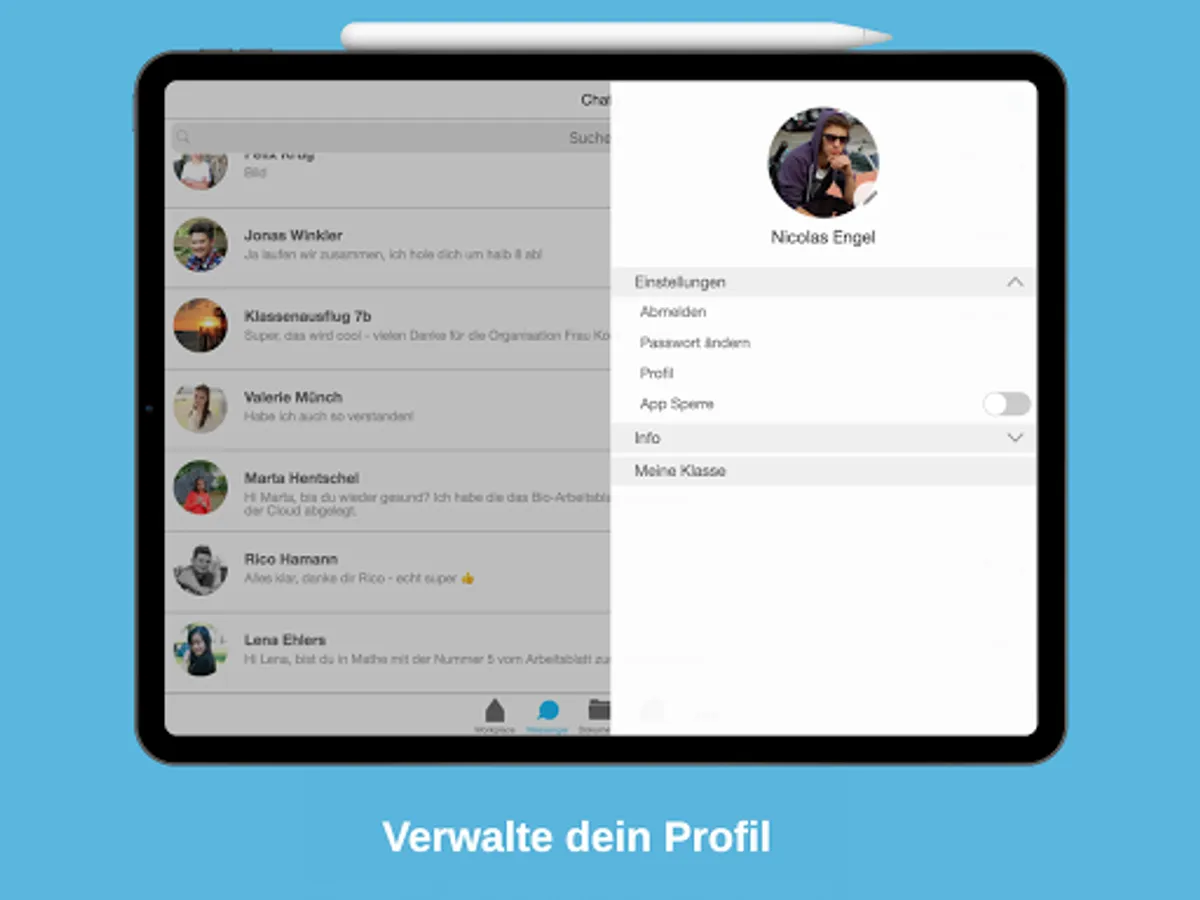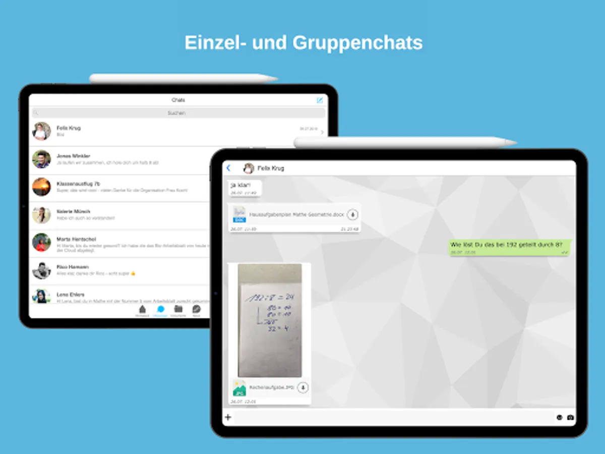 The introduction of tablets in schools requires a communication system, according to the European Data Protection Directive (DSGVO). The users (pupils, teachers, parents, employees of the school administration) are in a closed community. Files sent by chat are on the school's "private" cloud, i. Each school has its own messenger instance and thus has data sovereignty and data rights. If school scripts are exchanged, the recipient receives a push message.