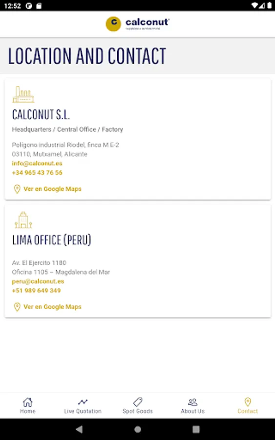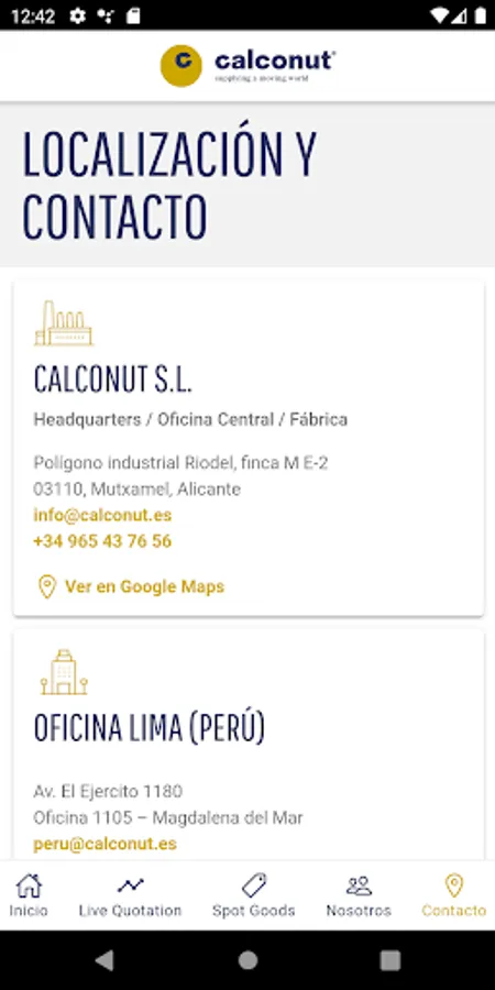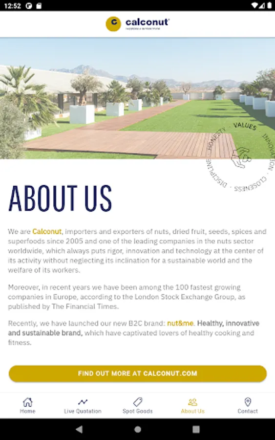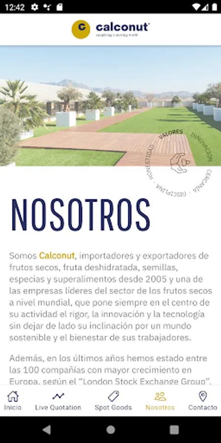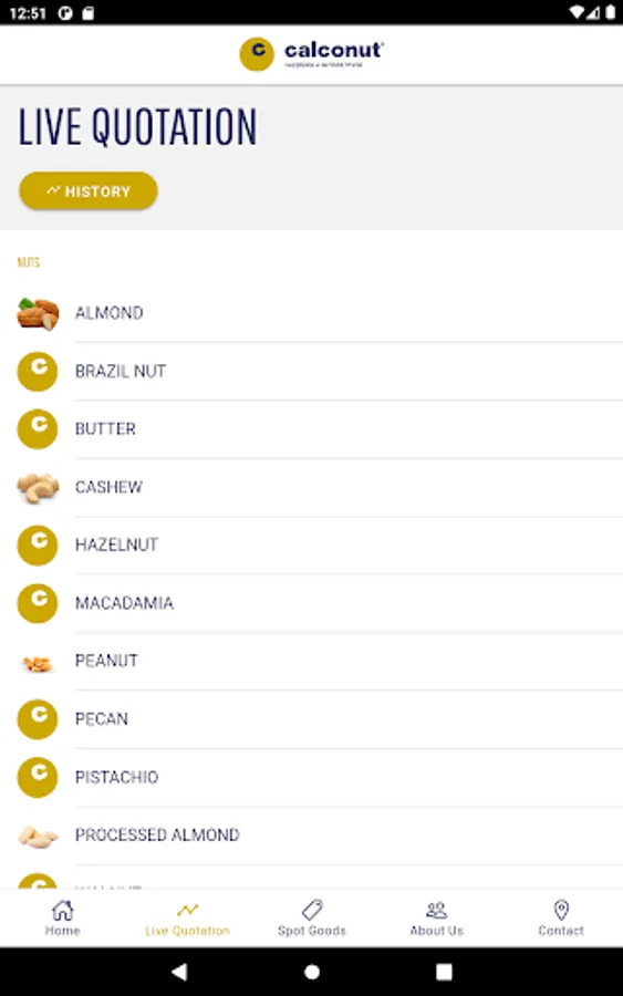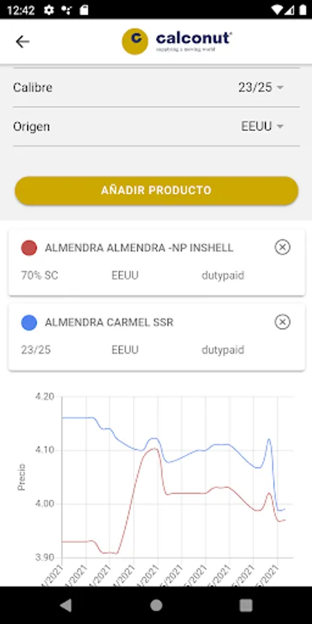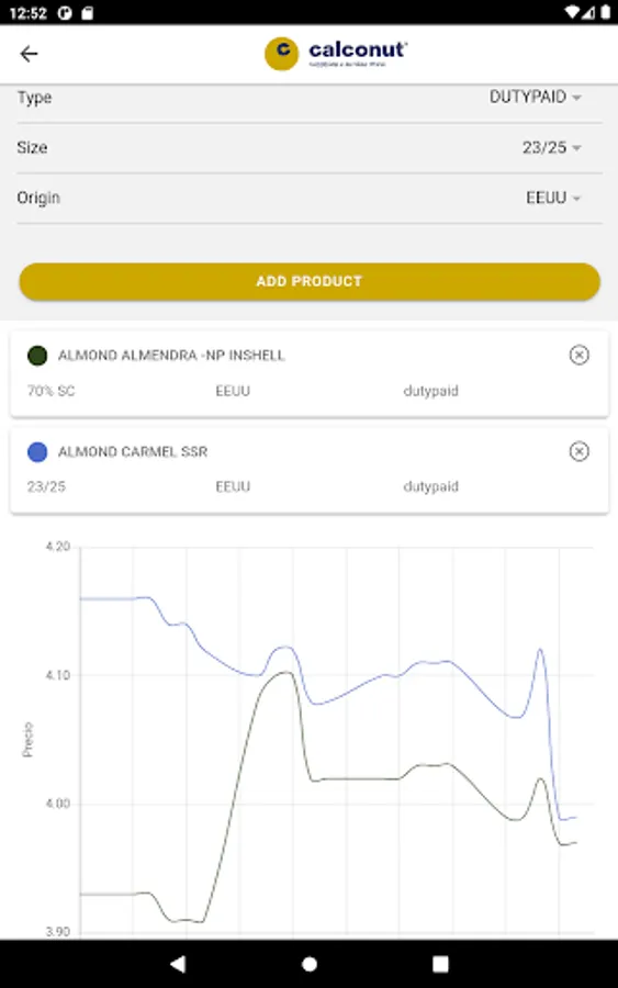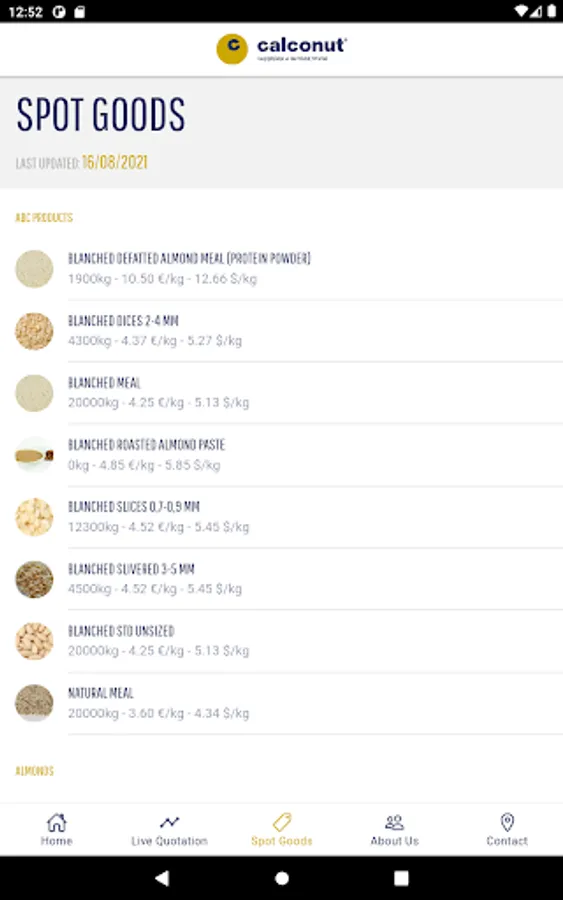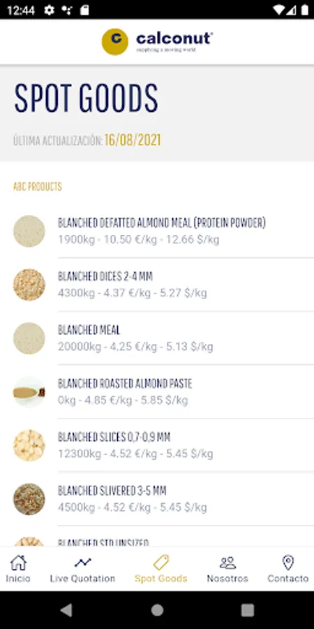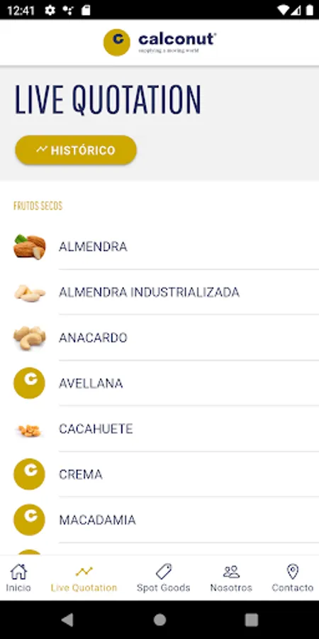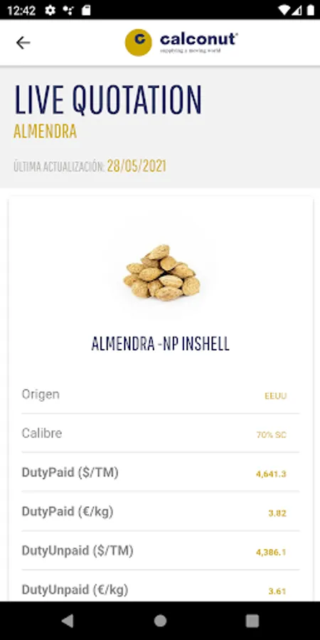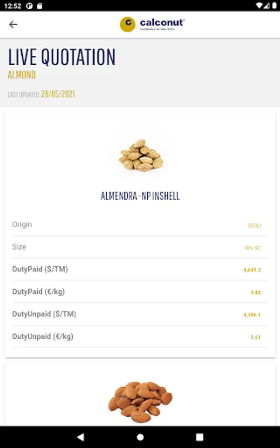 Calconut application for mobile devices and tablets for specialists in the sector of nuts, dehydrated fruit, dried fruit, seeds, legumes, spices and superfoods. In this application you will find live product quotes where you can also check their price history per product and the first prices of products that have just arrived at port along with a video of the actual merchandise.