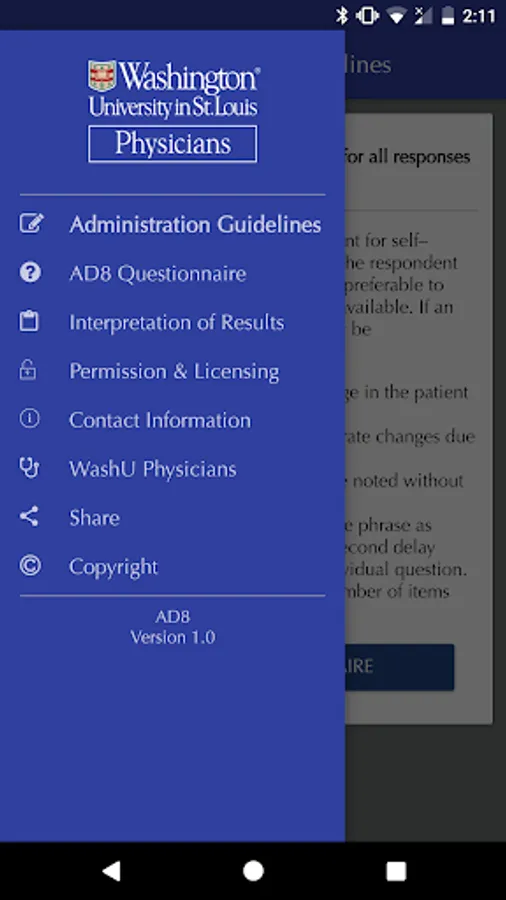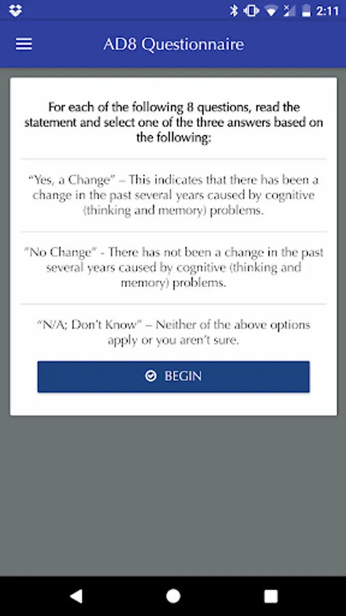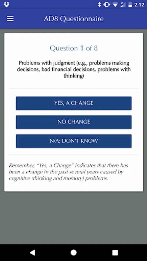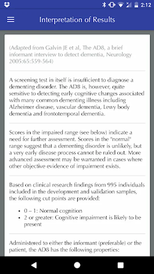 The AD8 is an 8-question interview tool which distinguishes individuals with very mild dementia from those without dementia, regardless of etiology. Questions are given to the respondent for self–administration or can be read aloud to the respondent either in person or over the phone. It is preferable to administer the AD8 to an informant, if available. If an informant is not available, the AD8 may be administered to the patient. Administration guidelines along with information on interpreting the results are contained within the app.