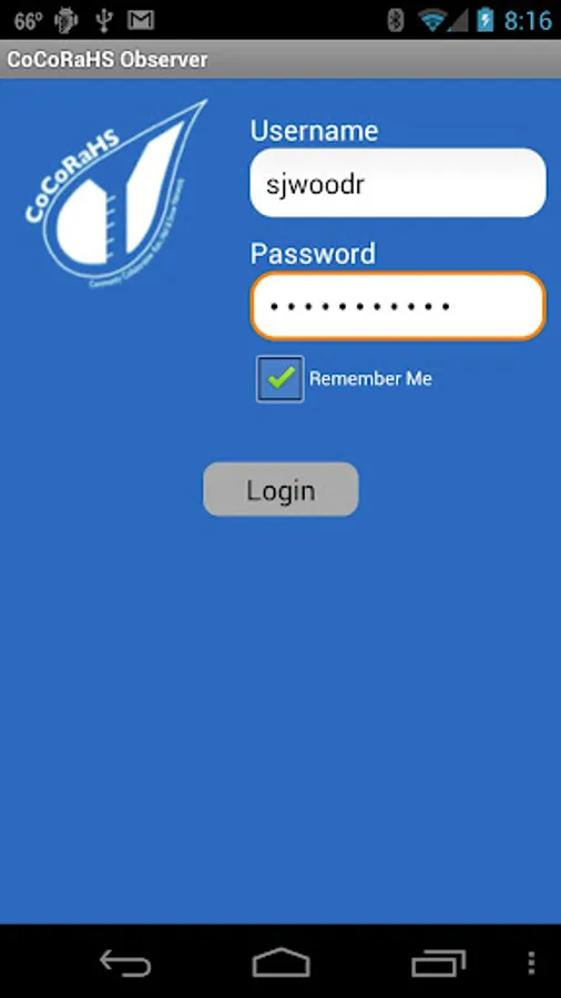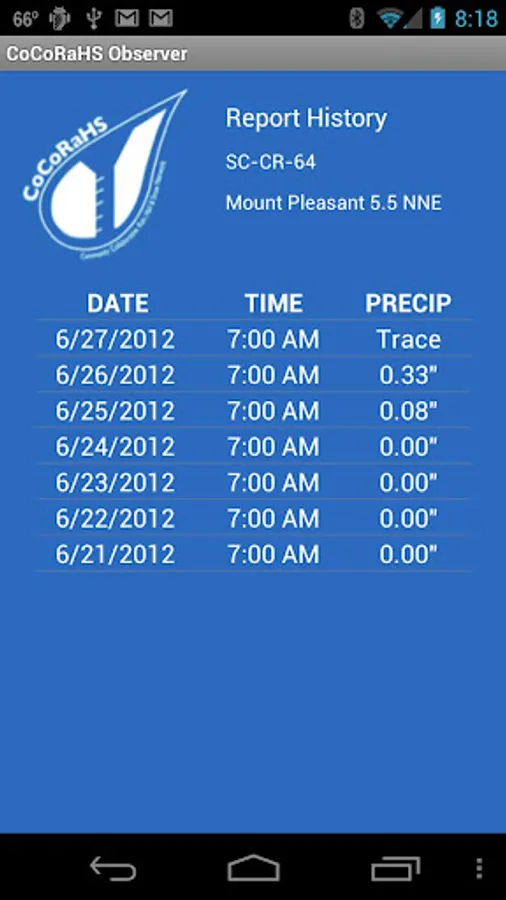 CoCoRaHS Observer for Android is an application that lets registered volunteer Observers submit their daily precipitation reports via their Android mobile device. In addition, users can view past reports to ensure accuracy.