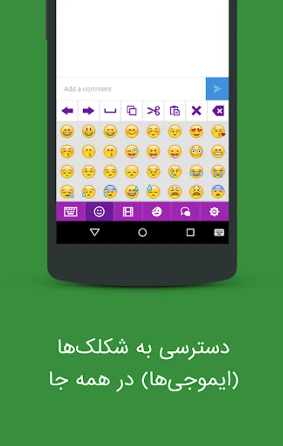 Advanced text editing features available in the emoticons and keyboard entries include cut, copy, paste, erase, move cursor, etc.
