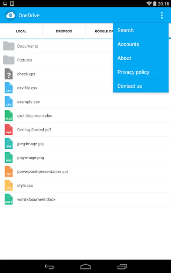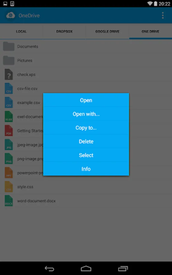 - Synchronization with Google Drive, Microsoft OneDrive, Dropbox and device file storage's