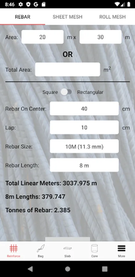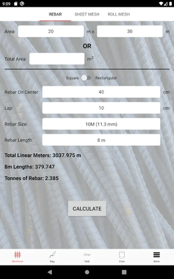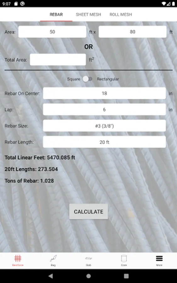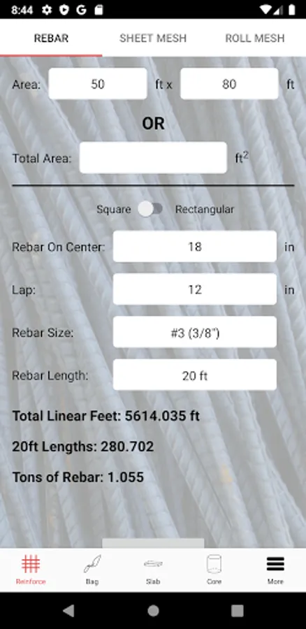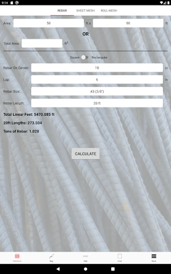 Rebar Calc supports both imperial and metric units for all calculations. The multi-function calculators allow you to calculate the tons and linear feet of rebar, sheets of sheet mesh, and rolls of roll mesh required for a given area of concrete. Rebar Calc also allow you to configure the amount of lap necessary for your job, the size of the rebar, sheet mesh, or roll mesh.