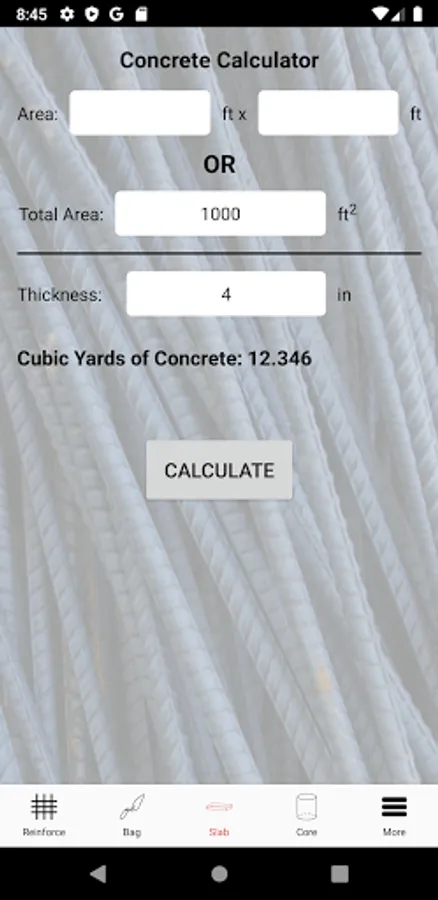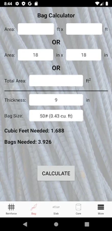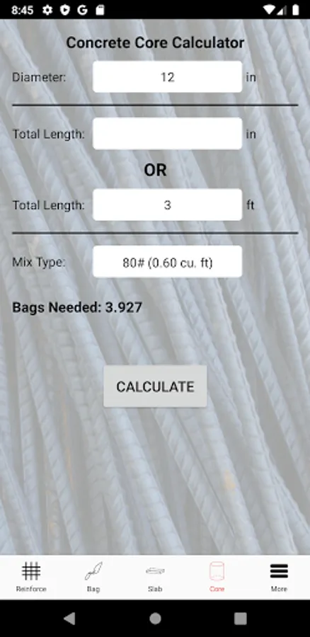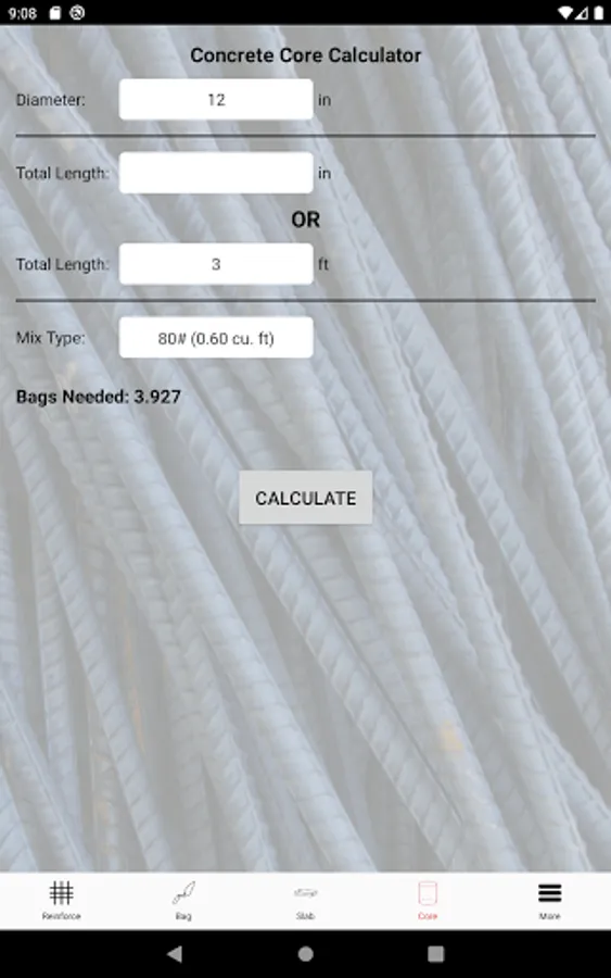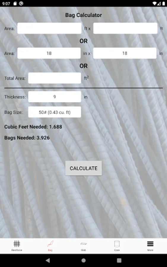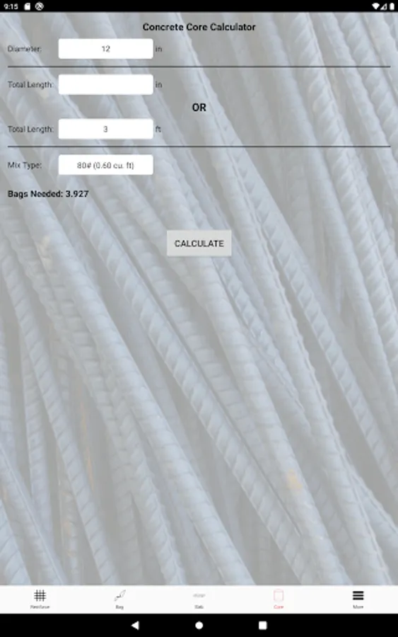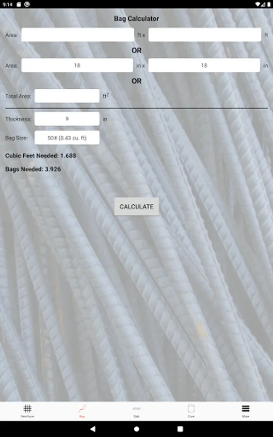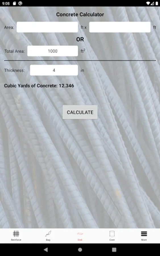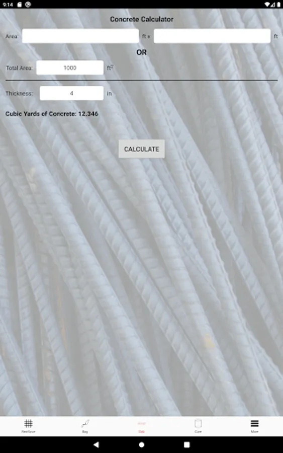 Additionally, Rebar Calc provides a quick and easy concrete volume estimator in cubic yards, and a calculator to determine how many bags of grout, fast setting concrete, etc. are needed for a slab or concrete cores.