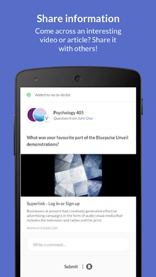 Introducing Bluepulse. Giving confidential feedback to your instructor during the semester has never been easier. Now you have the opportunity to help make your class better by responding to instructor feedback and giving your honest opinion. With Bluepulse you can say what’s on your mind in class – or at anytime, anywhere. See how easy it is to answer questions, give feedback, and let your instructor know whether you’re on track or not – all from the intuitive Bluepulse app.