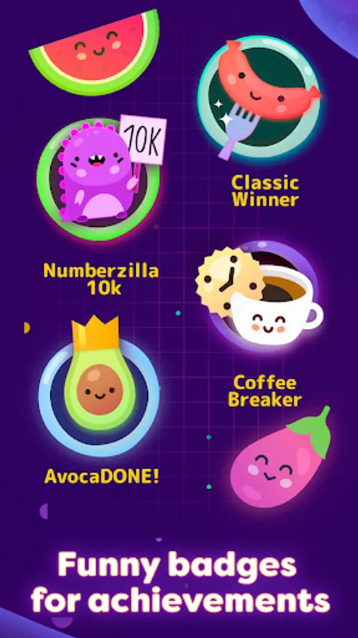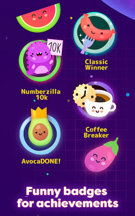 You will meet our cute mascot Numberzilla and friends - Smart Croissant, Sassy Avocado, Watermelon Warrior, and others. They will be happy to guide you through the rules in our zen number match game and will keep track of your achievements. You will receive funny badges with characters, for breaking time records, collecting game points, and completing the logic games.
