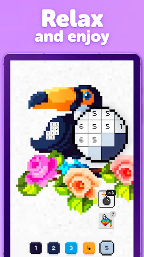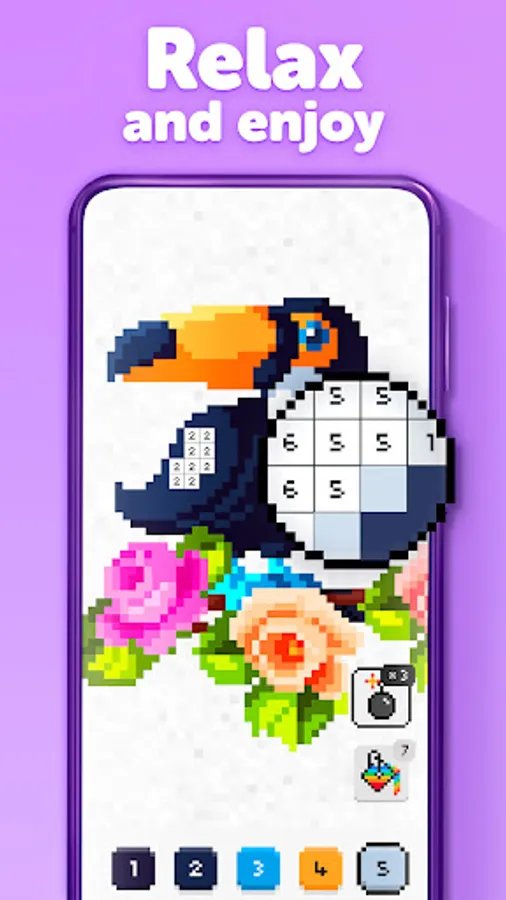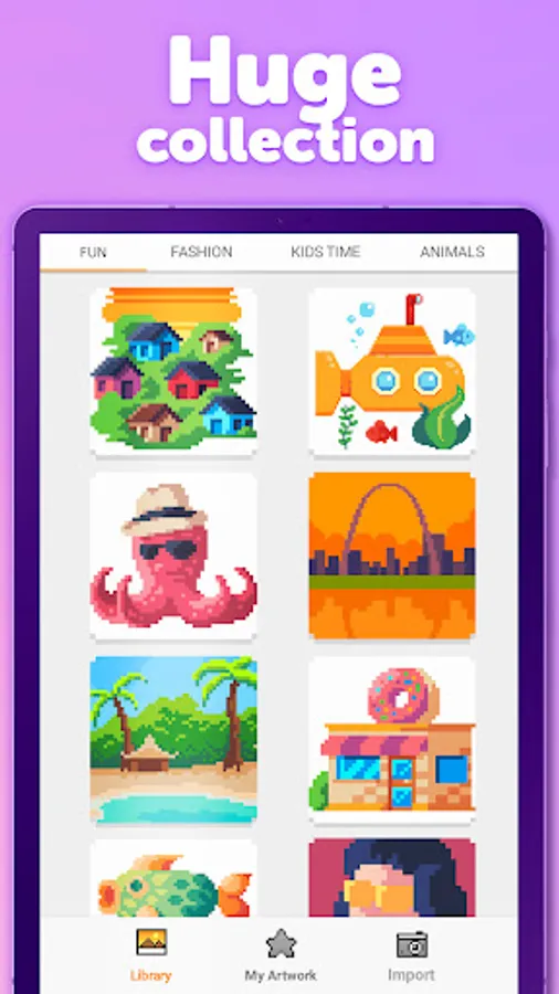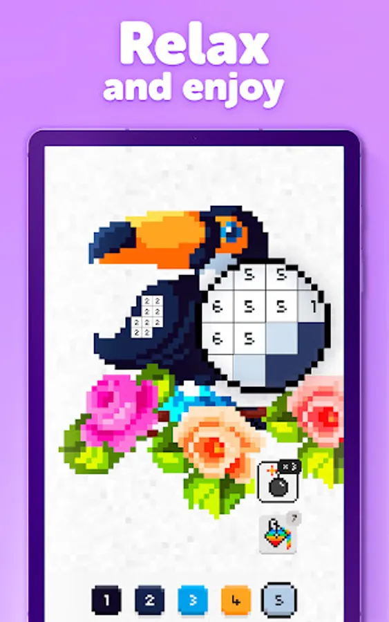 Discover the new world of unique illustrations, amazing pixel animals and birds, flowers and fairy-tale characters, as well as many other creatures. You will also find cool pixel geometric and abstract patterns inside the coloring books. Drawing by numbers has never been so fascinating.