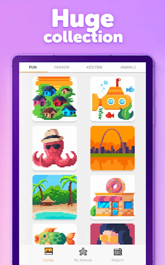 You will find more than 400+ original pixel art images from top graphic designers inside the colorbook. The high-quality painting game is an effective anti-stress color therapy. It’s not like other relaxing games, painting games or art apps. Properly crafted art coloring book helps to get rid of tension after a hard day, to get away from the routine, and, in general, art games will be useful for adults as a modern way of art therapy!