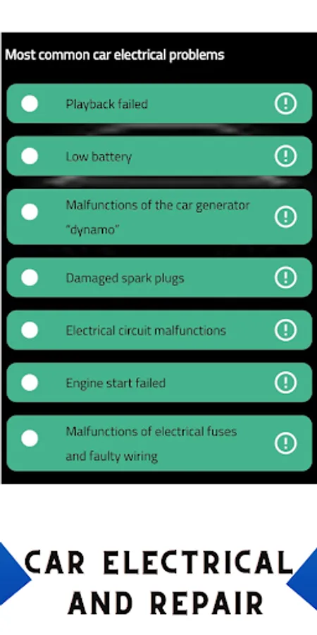 Our electrical repair for cars application presents the common causes and signs that cause problems in the car's electrical and provides how to deal with each of them and explains the reasons in detail.