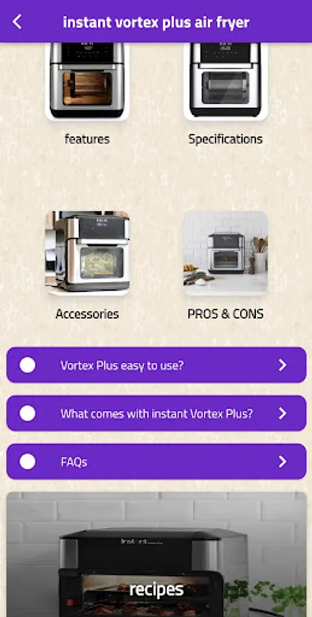 You are now in front of the instant vortex plus air fryer guide application, which offers you the following: