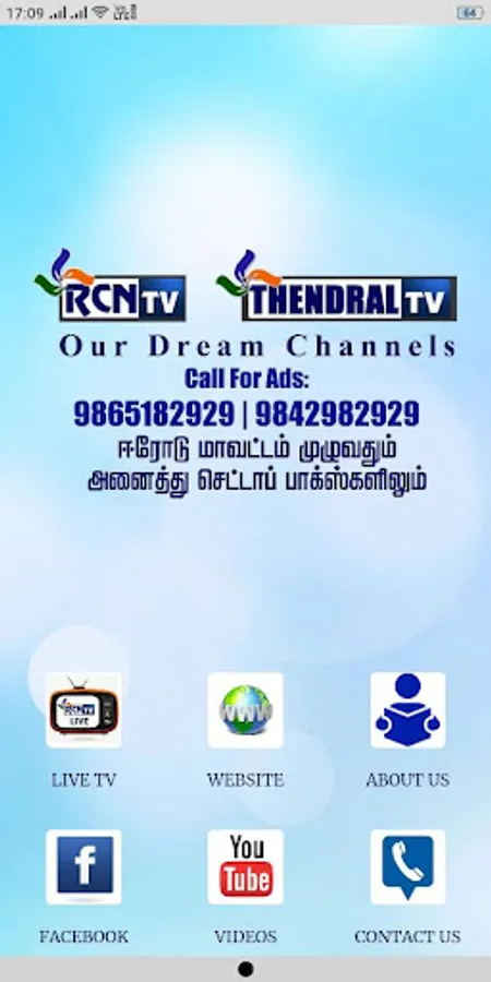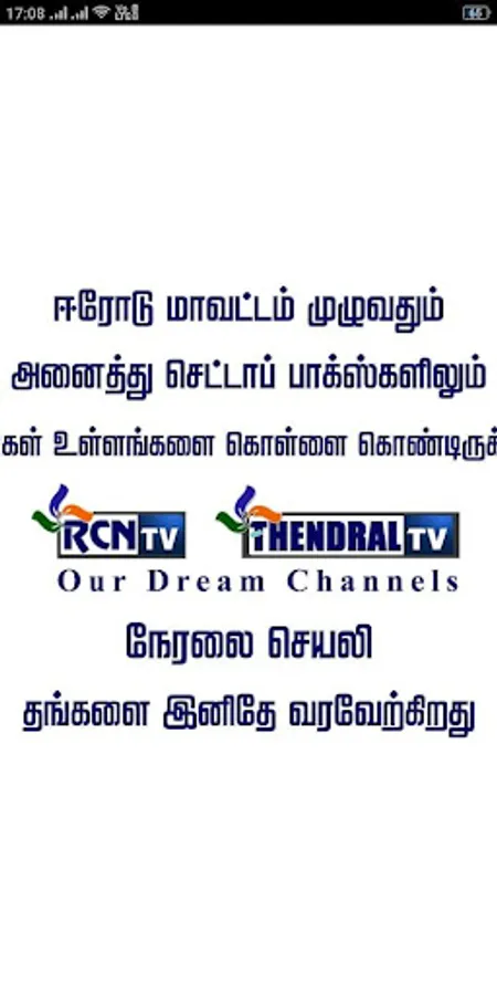 Erode RCN TV is one of the Well known and famous TV Channel in Erode. It has Quite Support from Erode people and it has been Telecasting many good Programs for the past 5 Years.
