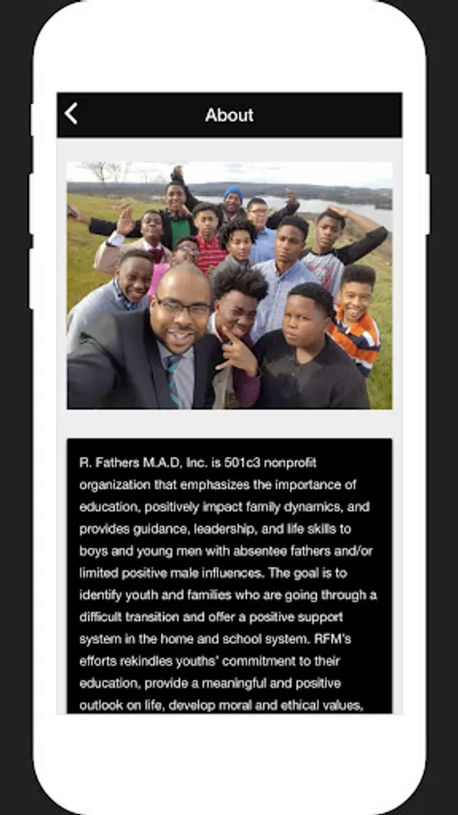 R. Fathers M.A.D, Inc. is 501c3 nonprofit organization that emphasizes the importance of education, positively impact family dynamics, and provides guidance, leadership, and life skills to boys and young men with absentee fathers and/or limited positive male influences. The goal is to identify youth and families who are going through a difficult transition and offer a positive support system in the home and school system. RFM’s efforts rekindles youths’ commitment to their education, provide a meaningful and positive outlook on life, develop moral and ethical values, build positive self-esteem, and enrich parenting skills that will positively affect home dynamics.