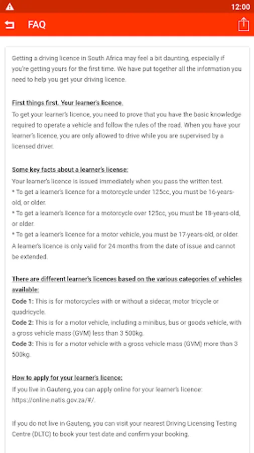 * FAQ tab - you can find all the information regarding your learner's and driver's license tests.