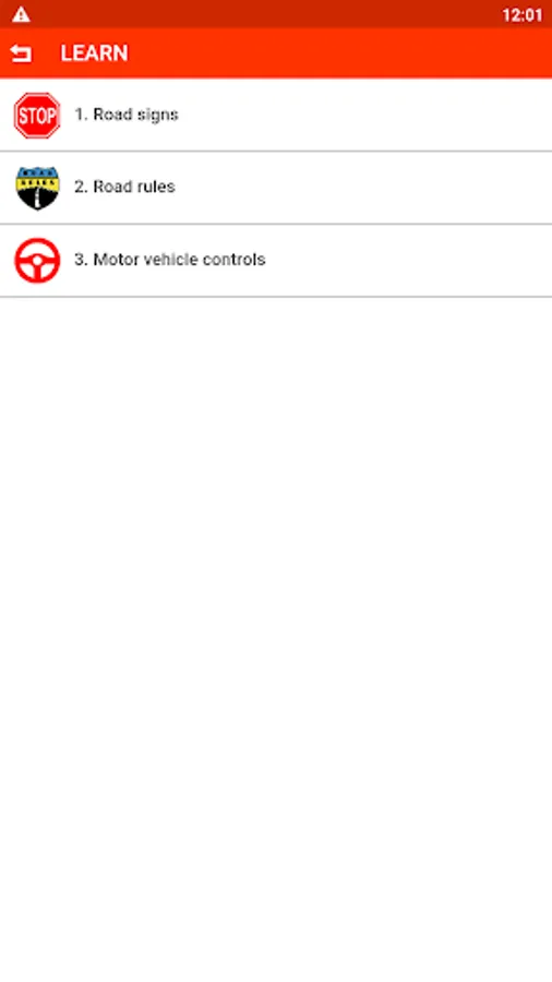 * LEARN tab - contains ROAD RULES, ROAD SIGNS and CONTROLS information that will help with your studies.