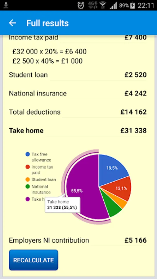 Simply enter your gross salary. The calculator will then show you your take home pay and PAYE (Pay As You Earn - A process by which HMRC collects employee taxes directly from the employer).