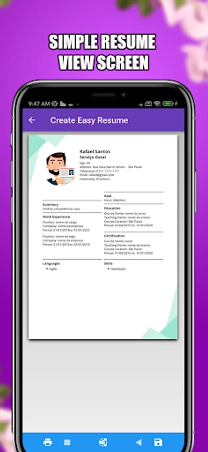 We understand the importance of a well-done resume to achieve your professional goals. With that in mind, we've introduced My Easy and Simple Resume, an essential tool that will help you stand out among candidates. Our app is perfect for anyone who needs to create a high-quality resume efficiently. With several professional models at your disposal, you can structure your resume according to the specific needs of your career and industry. Creating a PDF resume has never been easier. With our app, you'll have clear guidelines on what to include in each section of the resume, ensuring that your most relevant skills and experiences are evidenced effectively. My Easy and Simple Resume allows you to save your resume in PDF, share it by email, show it to friends and family, or print it out to take with you to job interviews. With a current, customizable design, you'll be well-equipped to grab employers' attention and land the job you crave. Aware of the competitiveness of the job market and the stress that job hunting can cause, we designed our app to be intuitive and easy to use. We want you to be able to focus on what's really important: finding the perfect job for you. Don't wait any longer! Start creating your professional resume with My Easy and Simple Resume right now. With a variety of resume templates and valuable tips at your disposal, you'll be closer to your dream job in no time. And best of all, our app is completely free! Download now and start walking the path to your professional success.