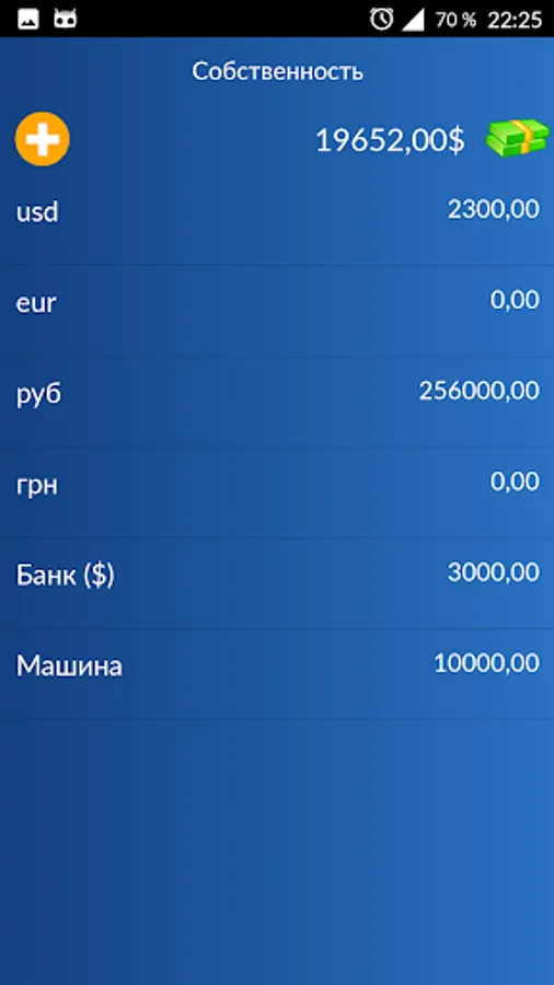 A simple notebook costs, and funds in different banks, real estate, cash, ... for which the program allows you to calculate your current state of the dollar.