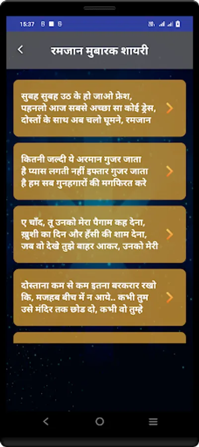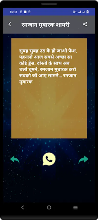 We display Ramadan & Jumma Mubarak messages with greeting that will make you feel good environment around you while you are viewing messages and greetings. This app has a very simple and user friendly Interface.