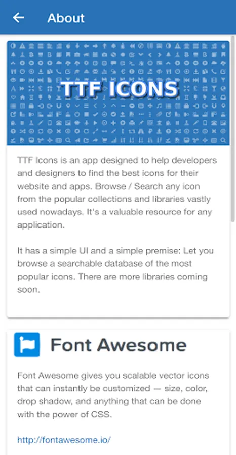 TTF Icons is an app designed to help developers and designers to find the best icons for their website and apps. Browse / Search any icon from the popular collections and libraries vastly used nowadays. It's a valuable resource for any application.