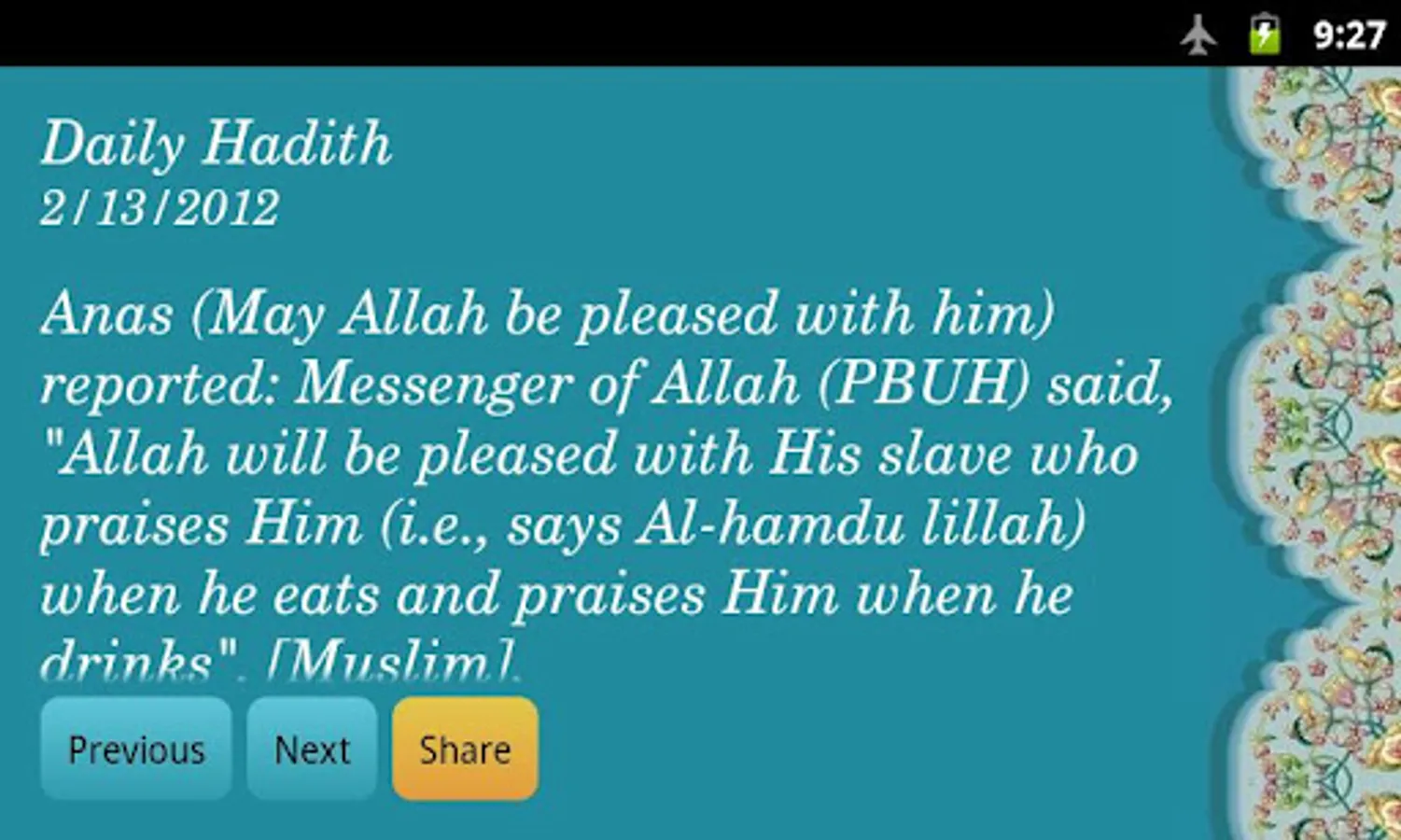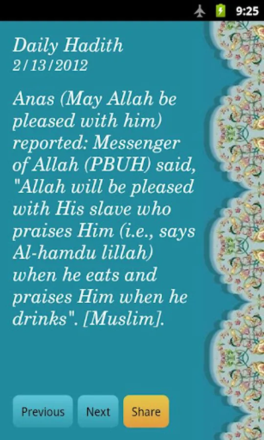 - Share hadith (Facebook, email, SMS, etc.)