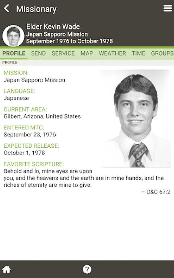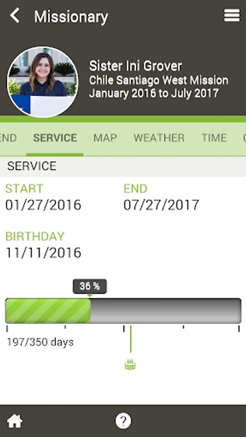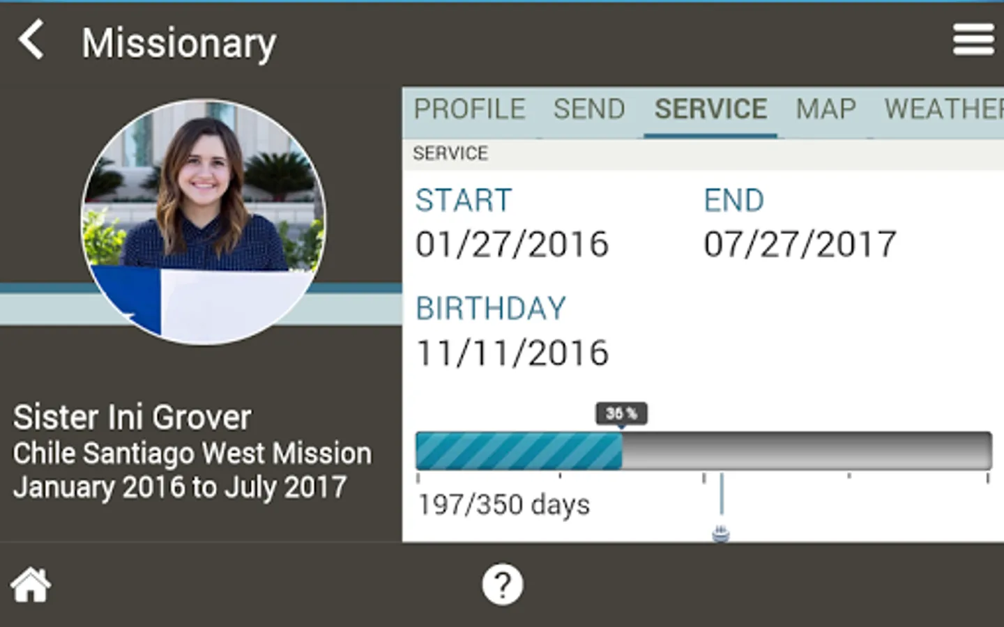 - View missionary's departure date, return date, days served, days remaining and percent complete.