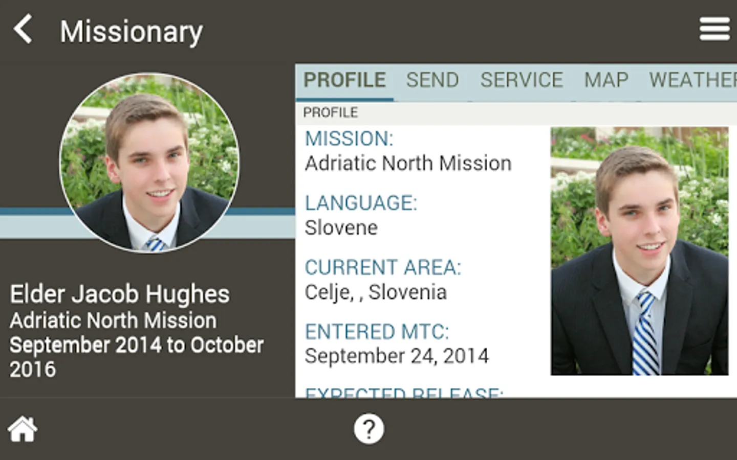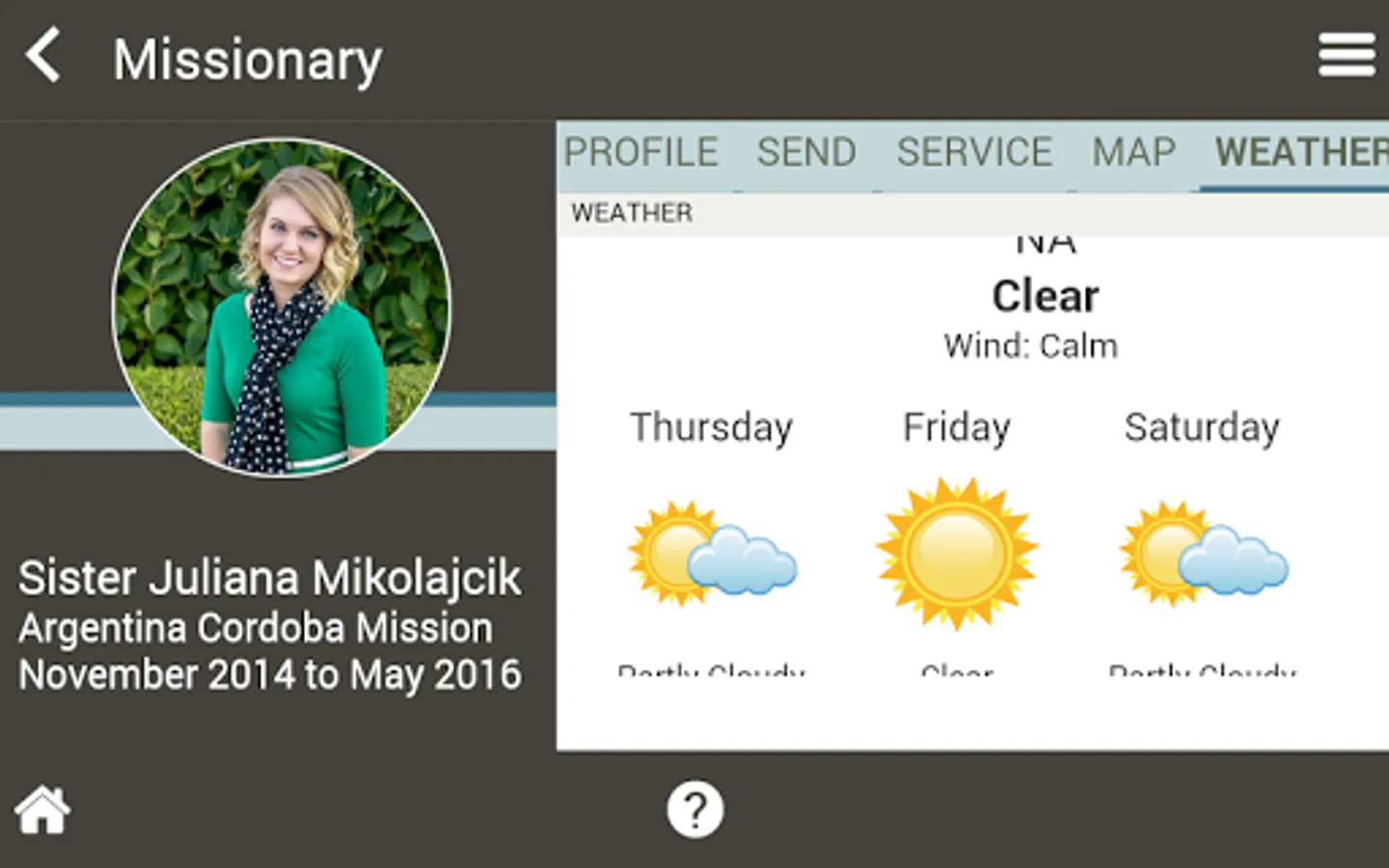 Called to Serve lets you track when all of your Latter-day Saint missionaries will be returning, down to the second, and local weather information including a 4 day forecast; no more wondering if they are hot or cold.