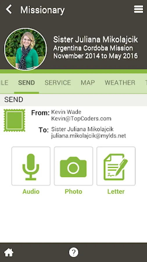 - Send pictures, emails and audio recordings directly from the app to any missionary.