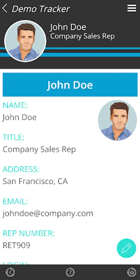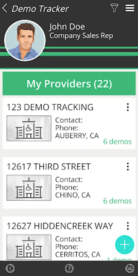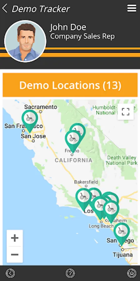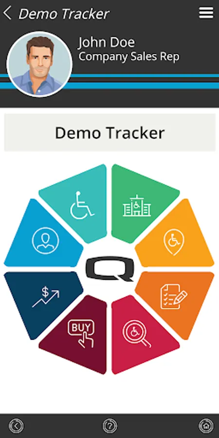 To use this app, sales reps start with the light-blue panel (9:00 o’clock position), then advance clockwise around the “Demo Tracker” main menu to use each of the primary features.