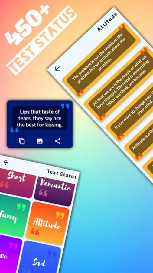 Text Status - Choose various categories of text status for your bio's/profiles copy to clipboard/share/export pictures