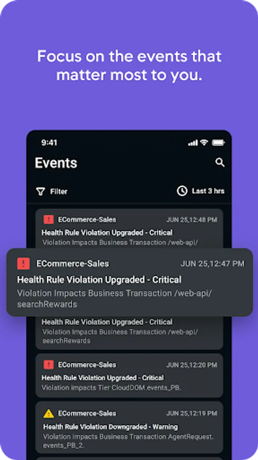 AppDynamics in the palm of your hand. View system performance and subscribe to push notifications so you only receive the alerts you need. Anytime. Anywhere.