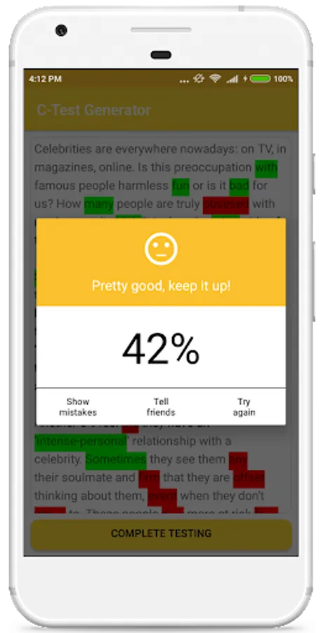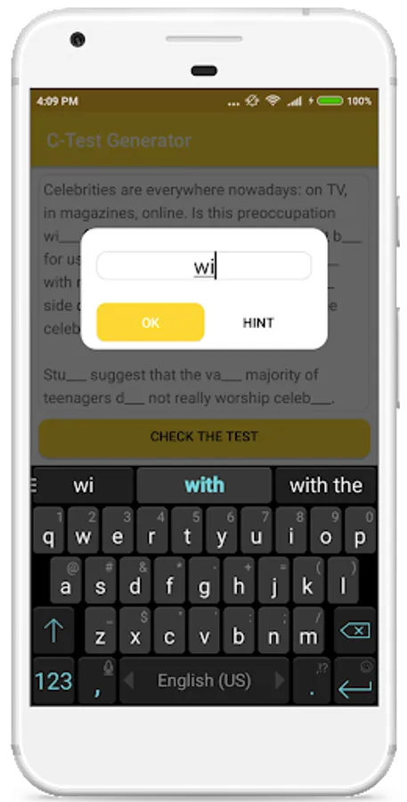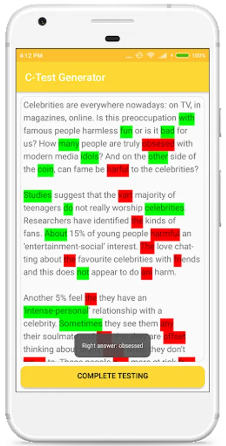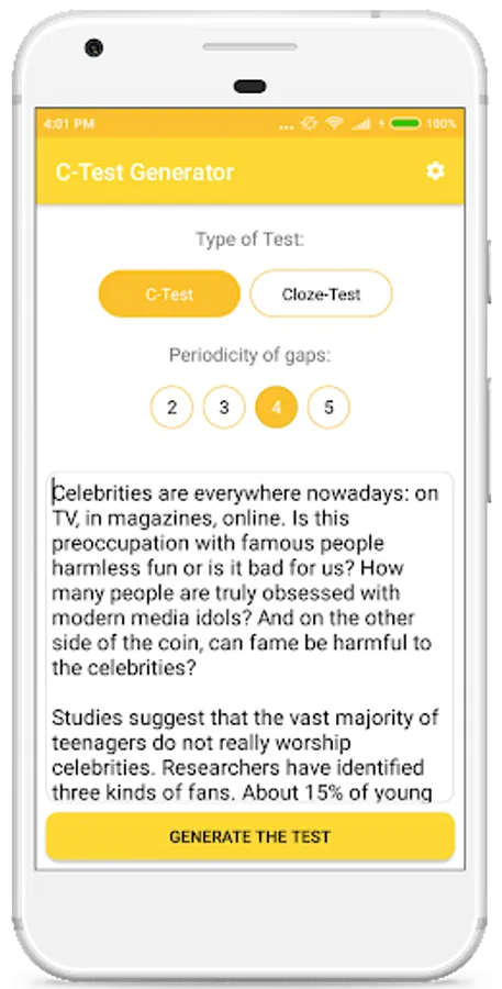 This app C-TEST GENERATOR is specially to help you prepare yourself successfully for various tests that include C - TEST or CLOZE - TEST.