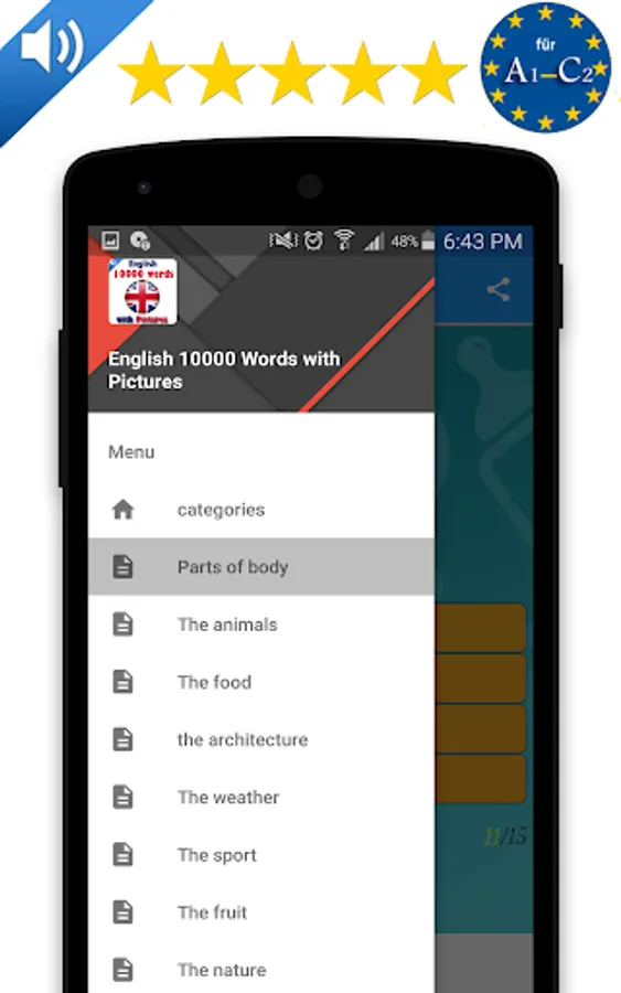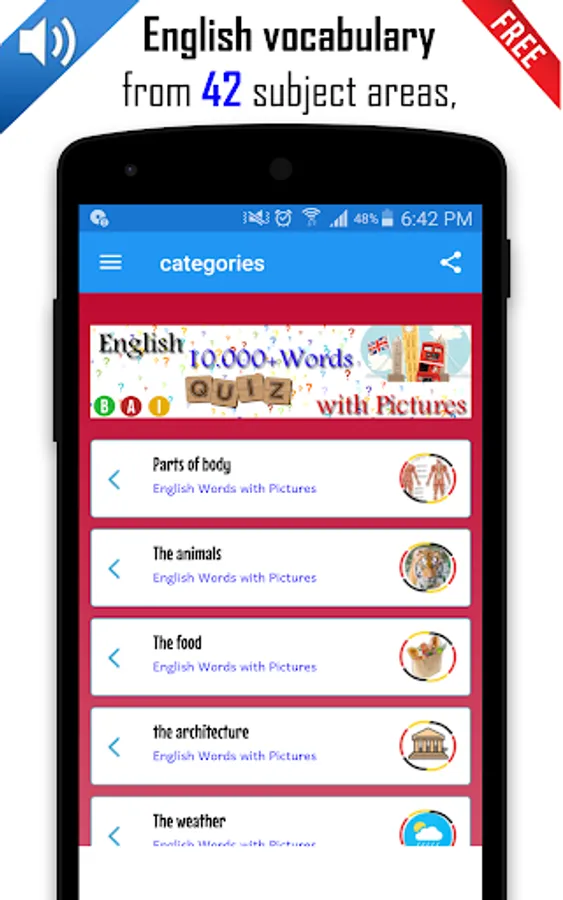 * English vocabulary from 42 subject areas, such as Learn to eat & drink, more will be added.