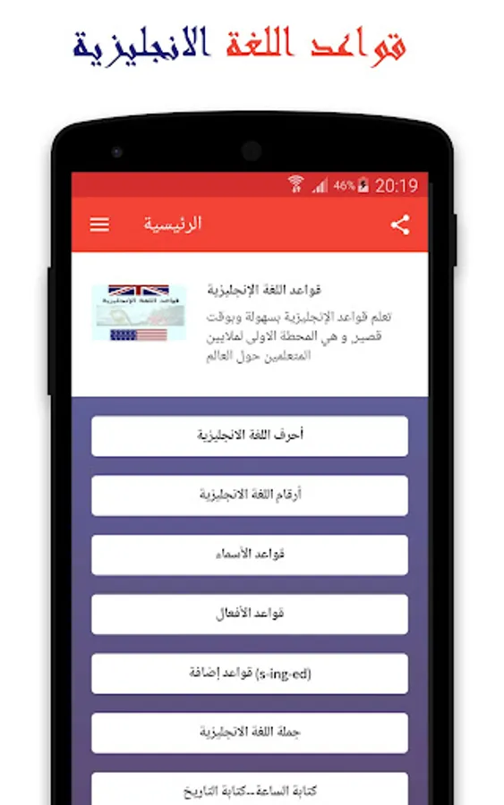 A comprehensive application of all English grammar for all levels from the beginning Urging you to learn the English language I do not think that you will need to search again for English grammar after downloading this English grammar application, you will find in it everything you need and this application contains a set of lessons and rules It also provides you with a simple explanation of each rule and we find among these lessons the English language letters, English language numbers, noun rules, verb rules, rules for addition, the English language sentence, writing the time, writing the date, the difference between the British and American languages, multiple-choice questions and many more Lots.