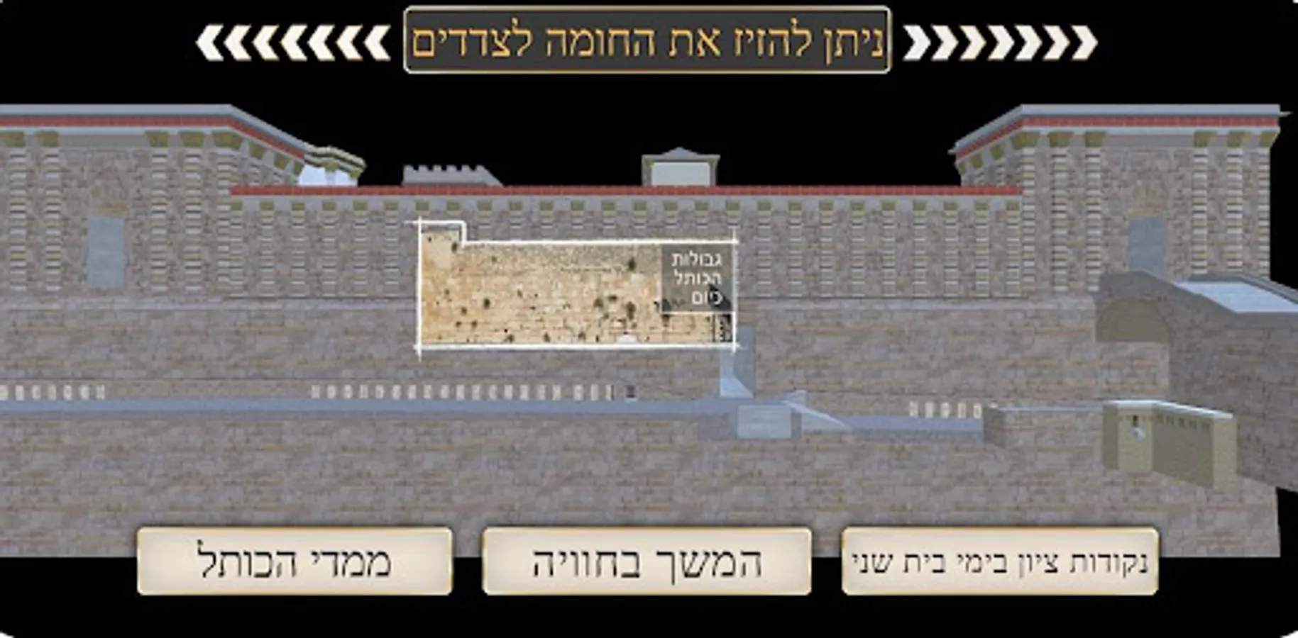 As part of the new service, which is open to the general public free of charge and available for download on Android and Apple devices, the visitor will be able to discover the image he would have seen if he had stood at the point where he is currently standing two thousand years ago. As part of this, he will be able to get a detailed overview of the dimensions and parts of the Western Wall, view the columns of the royal autumn that decorated the Temple, experience the singing of the Levites in the Temple, feel the atmosphere of the pilgrims to Jerusalem, watch the blessing of the priests from a bird's eye view and even travel through key periods and landmarks in history of the site from the Second Temple period.