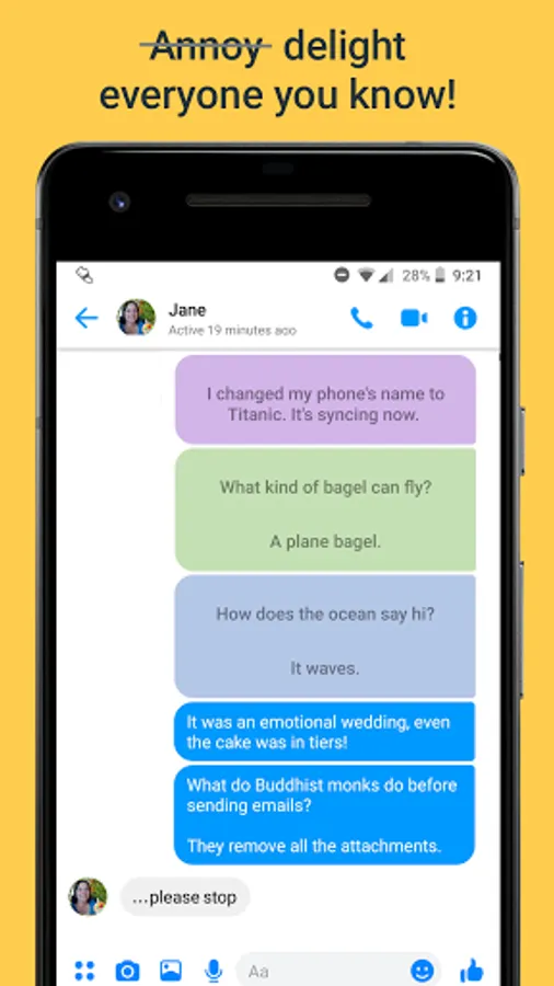 Our clean jokes are family friendly! You can safely share our jokes with your family, coworkers, kids, peers, students! If they lol at corny humor, they'll enjoy our joke app.