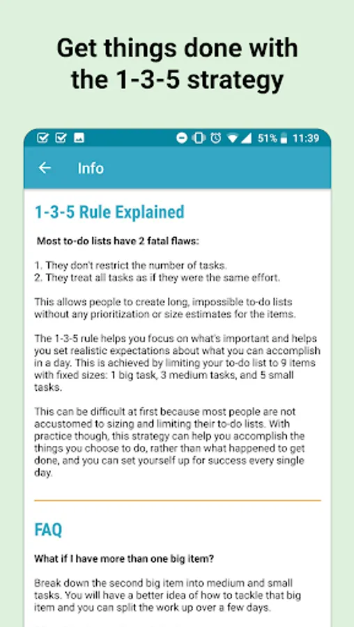 • view the built-in info page to read about the core concept (1-3-5 todo list rule) and get tips to optimize your daily checklist