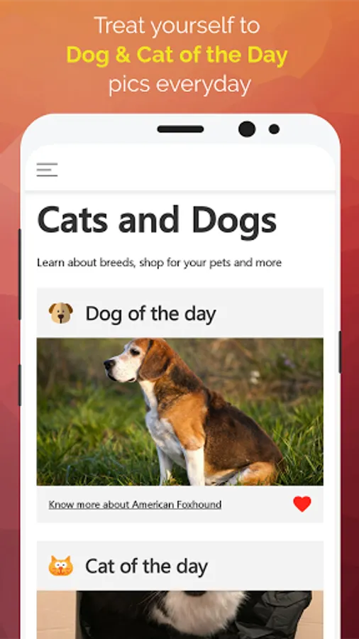 This app will help you find information about different breeds. Start your day daily by seeing a pic of a Cat and a Dog of the day !