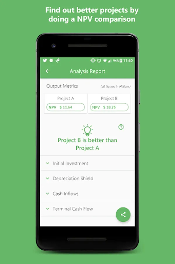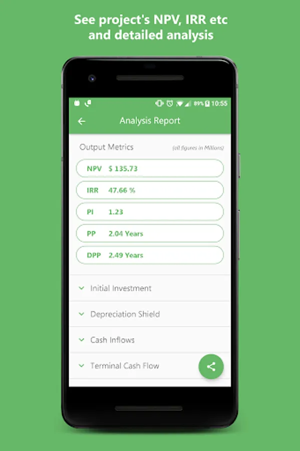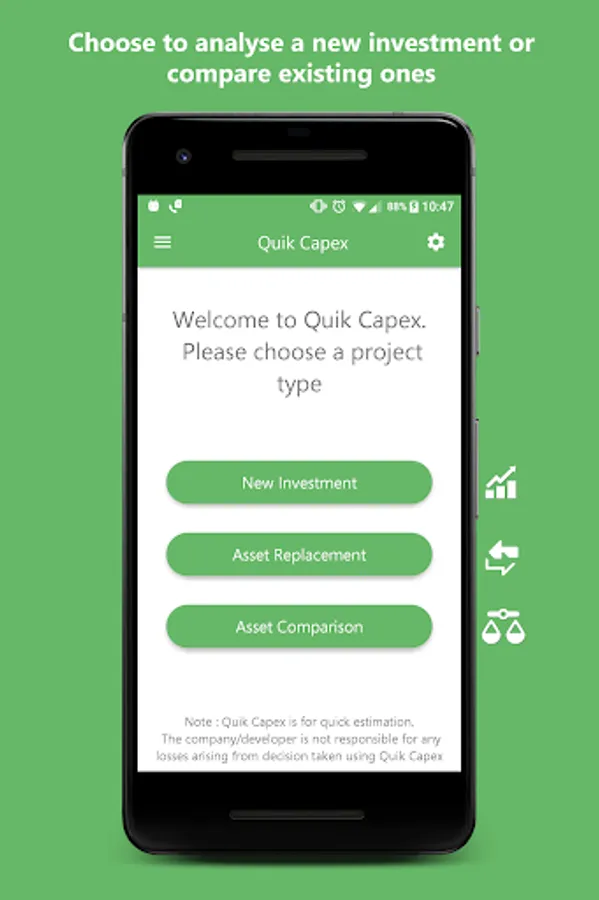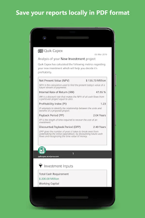 Quik CAPEX will allow you to immediately analyse a project on your smartphone. You can punch in your estimated cash outflows and inflows for a project or investment, and the application will calculate the projects’ Net Present Value (NPV), its Internal Rate of Return (IRR), Profitability Index (PI) and the Payback Period. A handy tool for financial managers that would like to discover the estimated return on the Capital Expenditure.