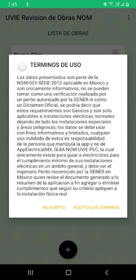 It is worth mentioning that this application is a guide for the review of an electrical installation, it does not in any way exempt the review of an expert registered with SENER and he is the only one who will be able to decide if the electrical work complies with the NOM and issue a UVIE.
