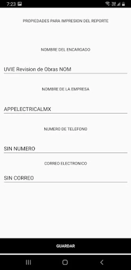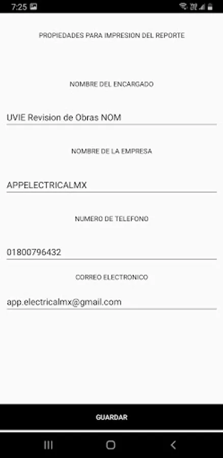 .- The report is personalized according to the user of the application, with "Name of the person in charge", "Name of the company", "Telephone number", "Email".