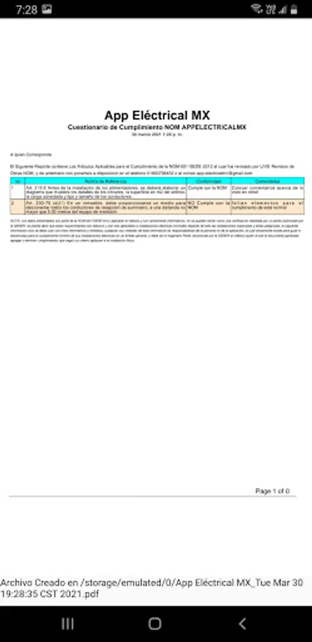 .- The report is personalized according to the user of the application, with "Name of the person in charge", "Name of the company", "Telephone number", "Email".