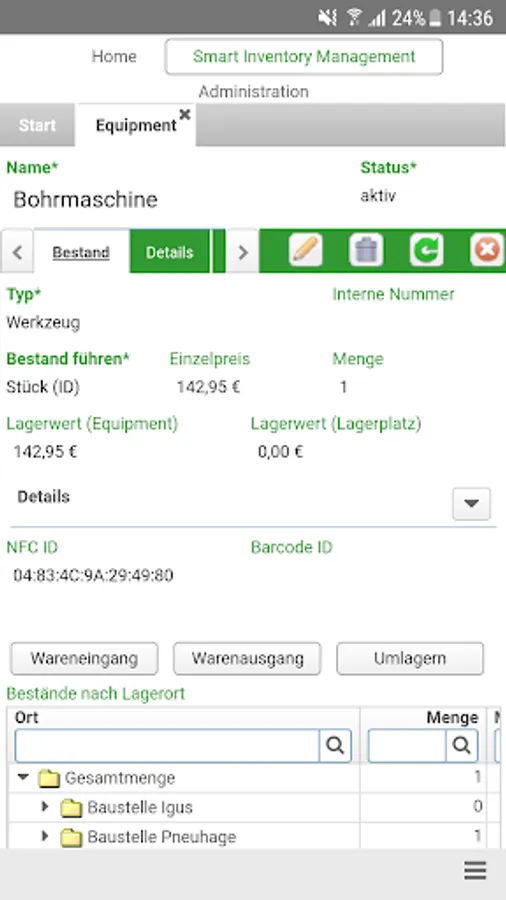 You can access all relevant information about your equipments from your mobile phone or tablet. Information about the equipments are identifiable via NFC-tag or bar-code. Different modules like creation of inventories, complaint, insurance management or test management enables the suitable management of your equipment.